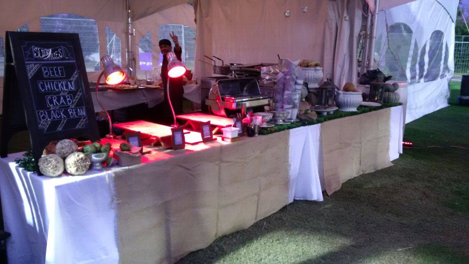 By looking at the set up of the table, center piece, heat lamps, chaffers, utensils, biodegradable disposables, real side plates, labels, fresh veggies.